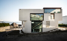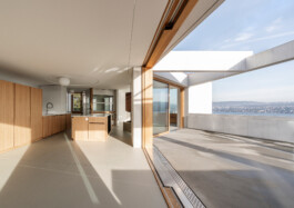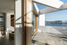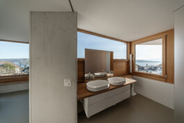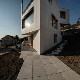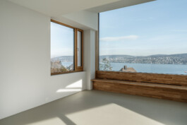 Das turmartige Haus am Hang in Kilchberg vereint die 180 Grad Seesicht von Zürich bis zu den Alpen mit dem Sonnenlauf an der Ostküste. Auf den ersten Blick paradoxe Eigenschaften erklären sich aus dessen Kontext: Grosszügige Verglasungen auf der Hangseite zum einfangen der Abendsonne; Wohnnutzungen auf der obersten Ebene, scheinbar entfernt vom Garten; der Kontrast zwischen komprimiertem Schlafgeschoss und der grossen Weite der Wohnebene.