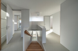 Die hybride Konstruktion einer weissen Sichtbetonfassade, welche das mehrheitlich aus Stützen und Platten bestehende Tragwerk aussteift ist die Antwort auf den Wunsch nach einer authentischen soliden Hülle. Der Rohbau wird mittels eines «Futters» aus Gipsleichtbau und Schreinerarbeiten sowie grosszügigen Eichenfenstern ergänzt. Das Erdgeschoss ist für den zukünftigen Ausbau einer Einliegerwohnung vorbereitet.